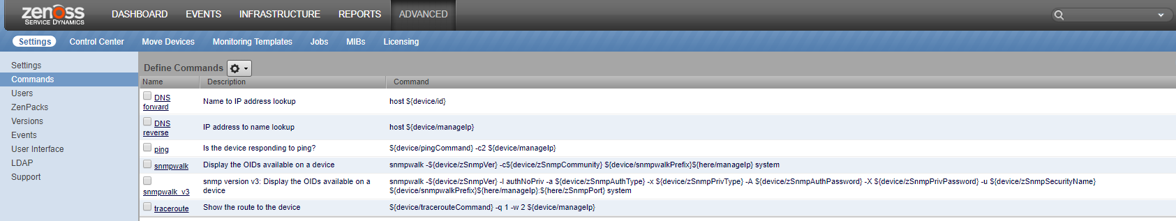 The ADVANCED > Settings > Commands page includes tools for managing the commands that can be run from various pages in Resource Manager.