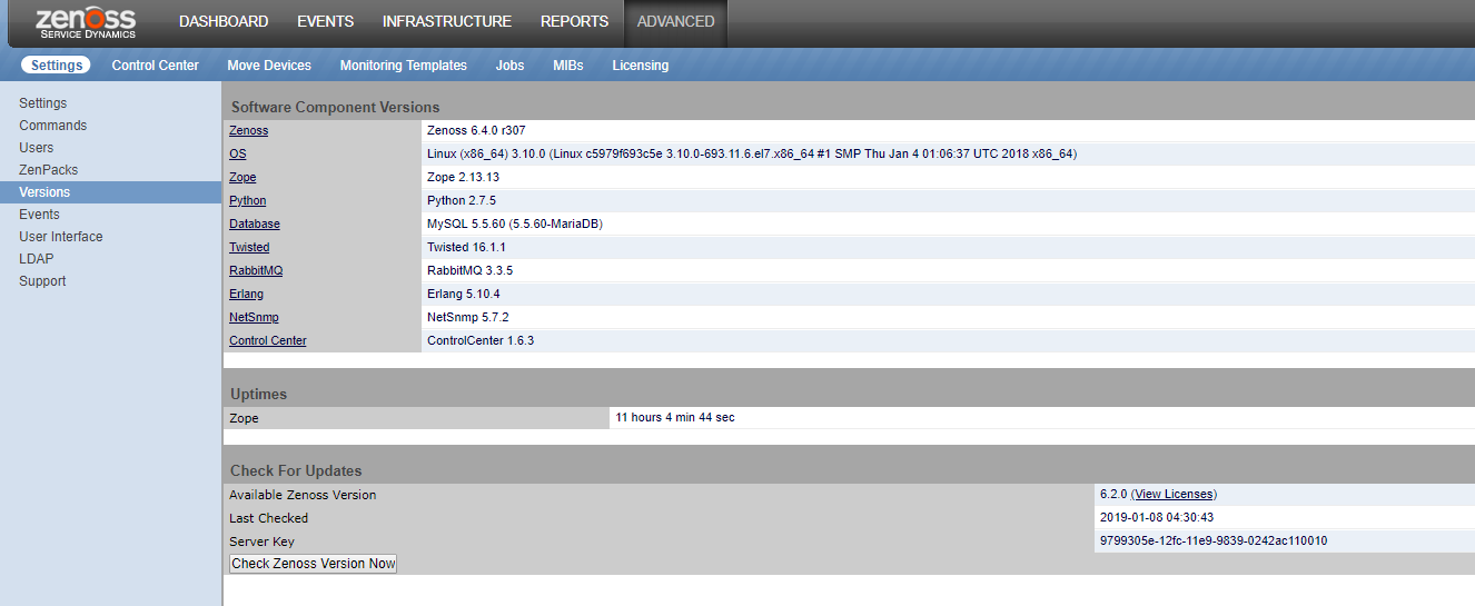 The ADVANCED > Settings > Versions page displays the version numbers of key software components.