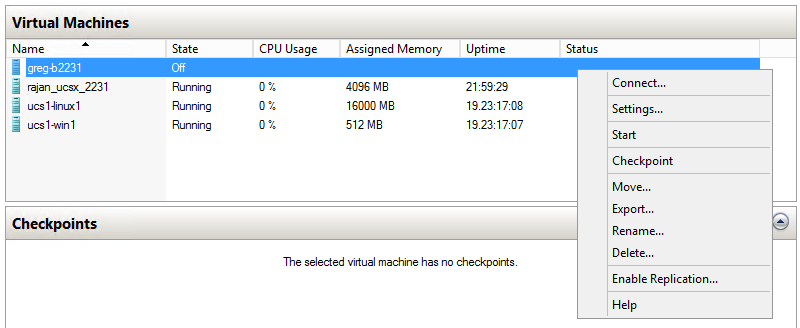 In the Hyper-V Manager Virtual Machines area, right-click the new virtual machine, and then choose Start.